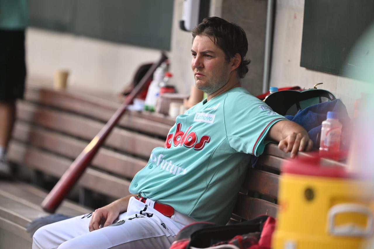Trevor Bauer relaxes in the dugout during a 14-strikeout performance against the Bravos de Leon on April 21 in Mexico City. (Photo Courtesy of the Diablos Rojos del Mexico)