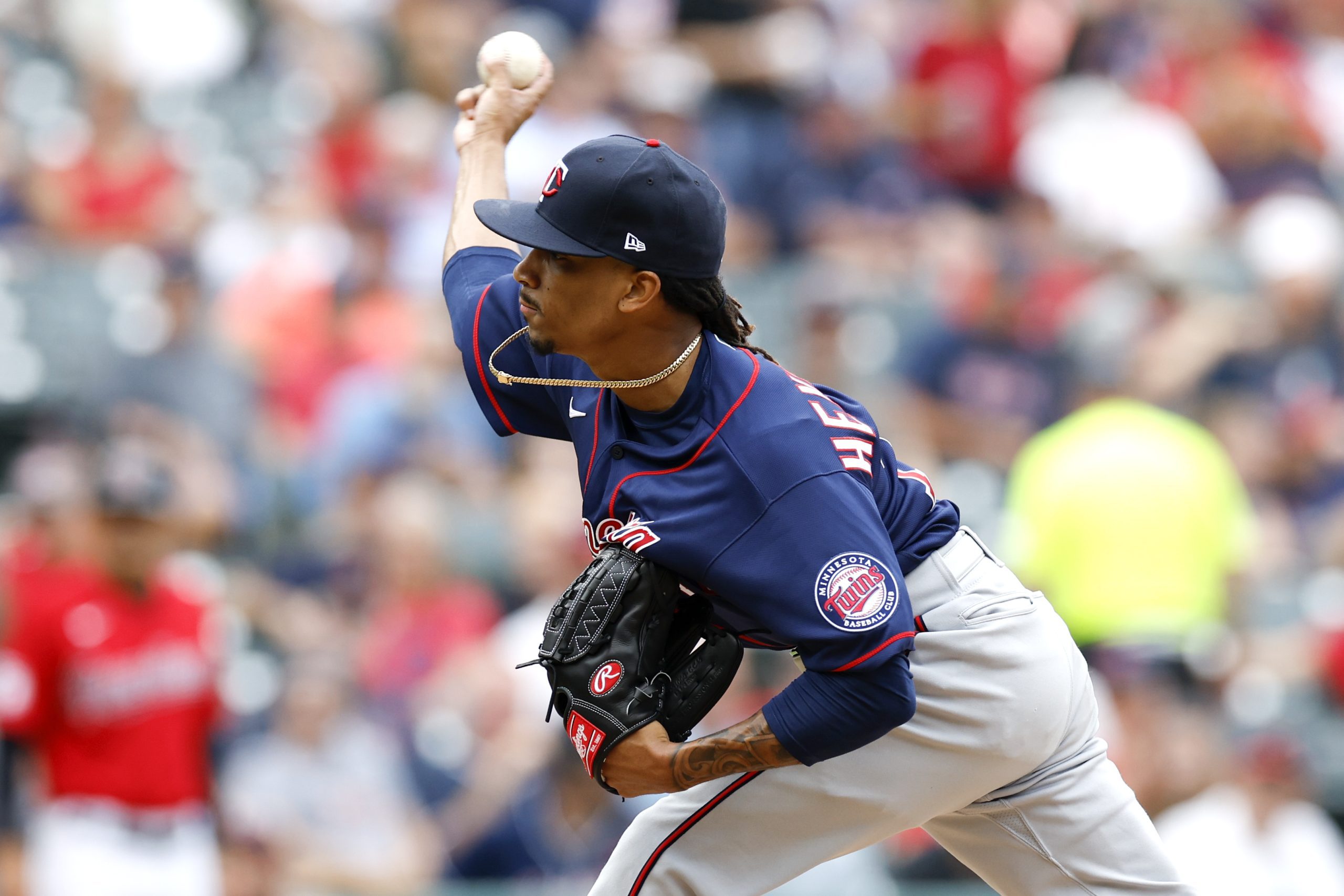 Ronny Henriquez #70 of the Minnesota Twins pitches against the Cleveland Guardians. (Photo by Ron Schwane/Getty Images)