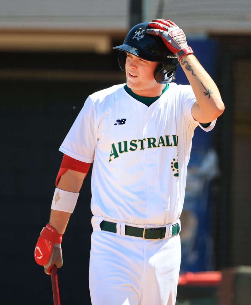 Drew Davies (below), Matt Trainor and Josh Nati each drove in a first-inning run to give Australia a 3–0 lead. Davies doubled home two more in the second to stretch the margin to 5–0 before Trainor added his second RBI of the day in the sixth.