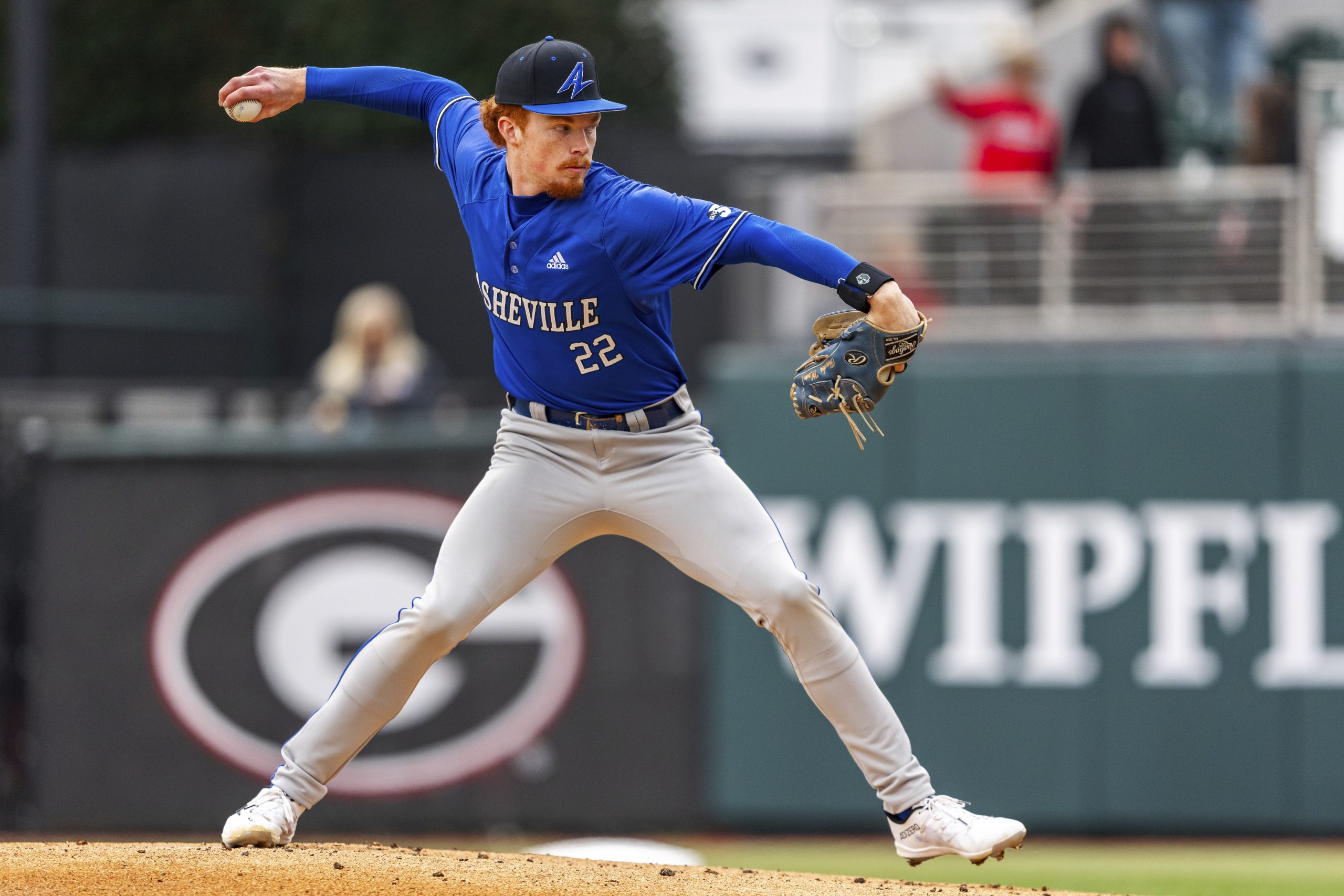 Photo: UNC Asheville’s Clay Edmondson (22) pitches during an NCAA baseball game on Sunday, Feb. 18, 2024, in Athens, Ga. (AP Photo/Jason Allen)