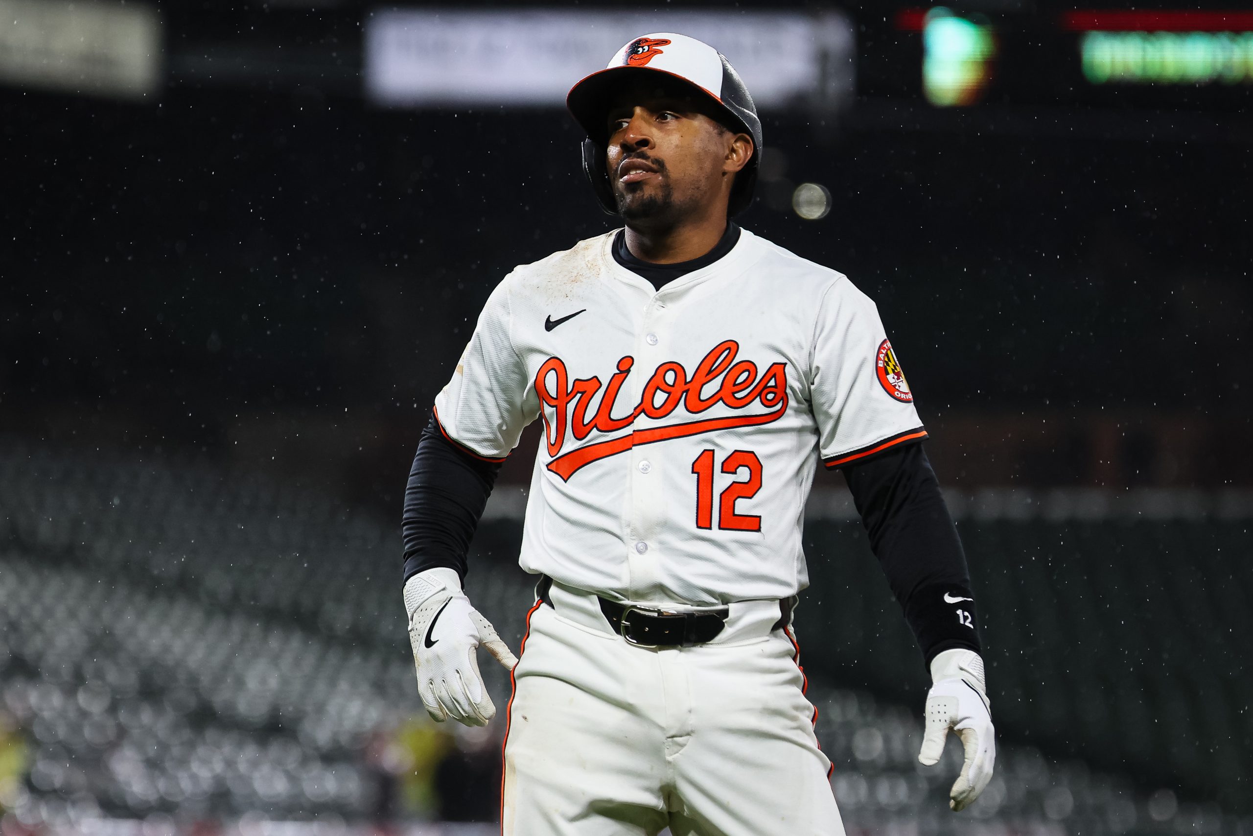 Tony Kemp #12 of the Baltimore Orioles looks on against the Kansas City Royals on April 2, 2024 in Baltimore, Maryland. (Photo by Scott Taetsch/Getty Images)