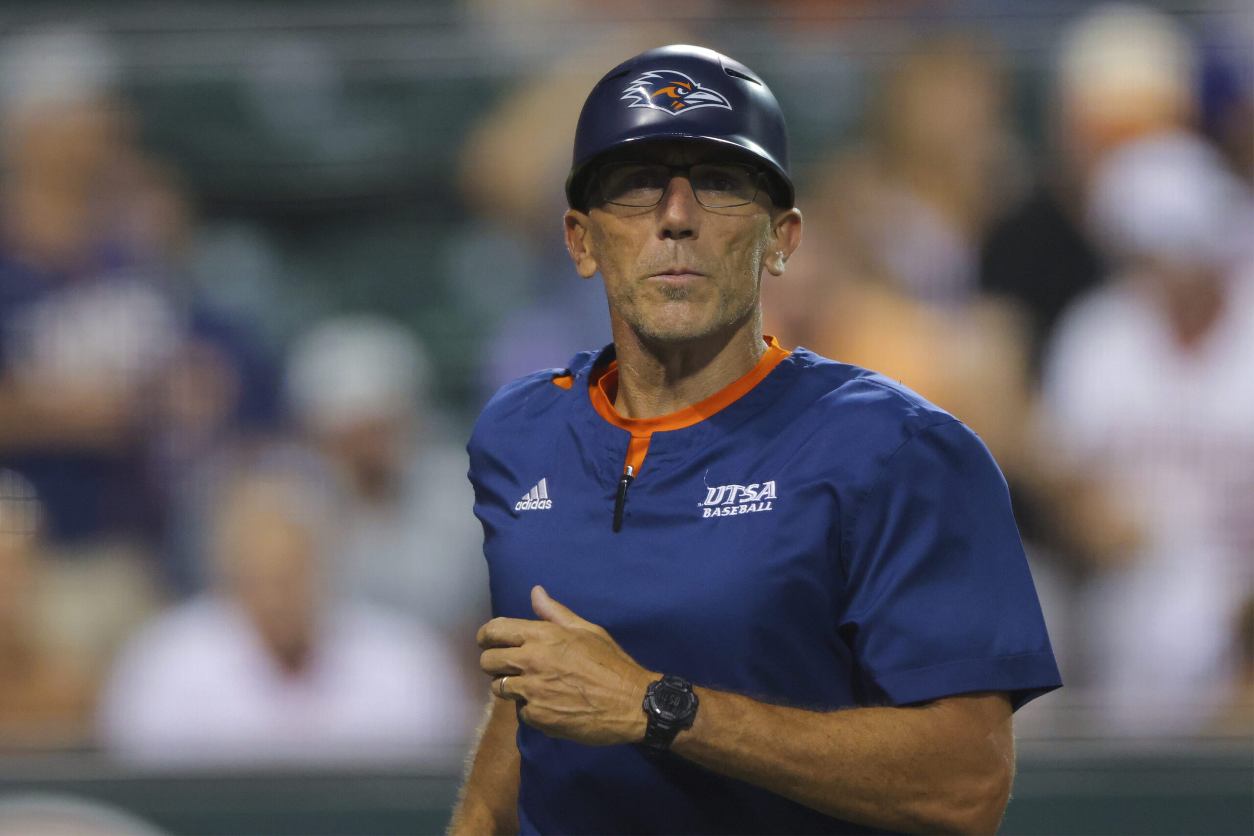 Photo: UTSA head coach Pat Hallmark moves to speak with his team as they compete against Kansas St. during an NCAA regional baseball game on Friday, May 30 2025, in Austin, Texas. (AP Photo/Stephen Spillman)