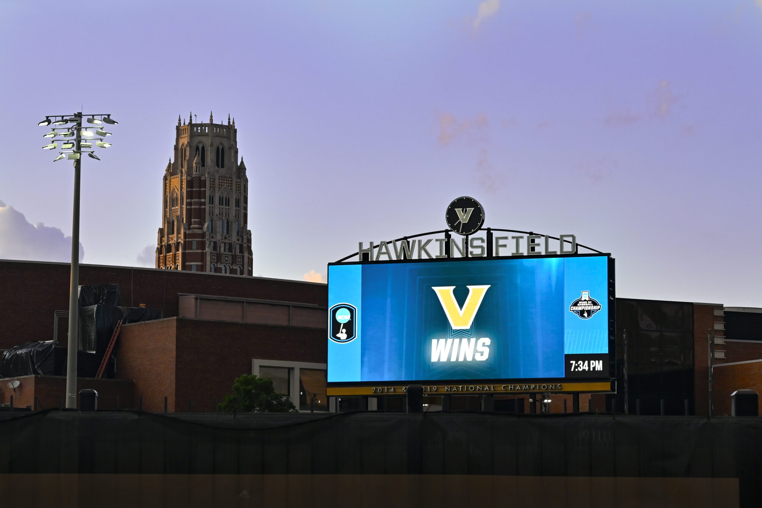 PHOTO: The scoreboard at Hawkins Fields Vanderbilt’s win against Wright State as the West End Tower rises in the background after an NCAA regional baseball game on Friday, May 30, 2025, in Nashville, Tenn. (AP Photo/John Amis)