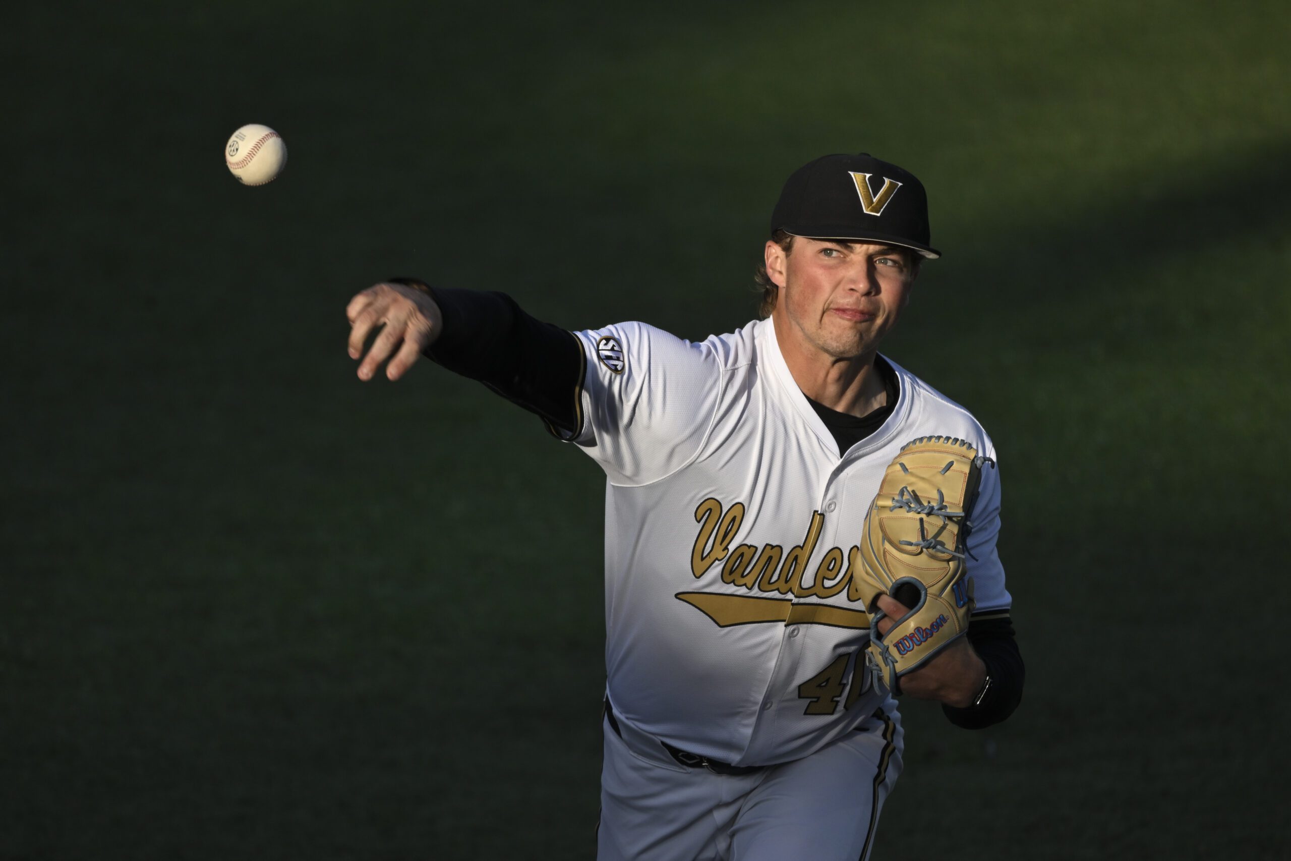PHOTO: Vanderbilt pitcher Austin Nye (40) plays Dayton during an NCAA baseball game on Tuesday, April 8, 2025, in Nashville, Tenn. (AP Photo/John Amis)