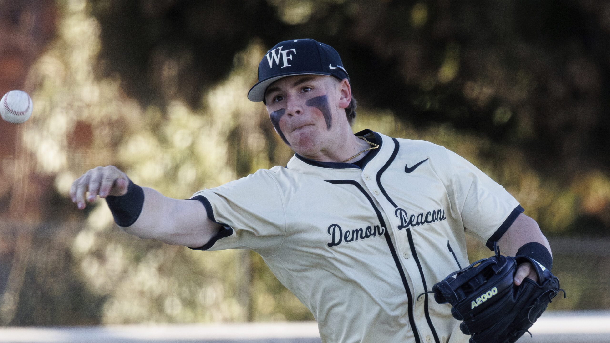 PHOTO: Wake Forest’s Dalton Wentz (1) makes a throw during an NCAA baseball game on Tuesday, Feb. 25, 2025, in Winston-Salem, N.C. (AP Photo/Ben McKeown)