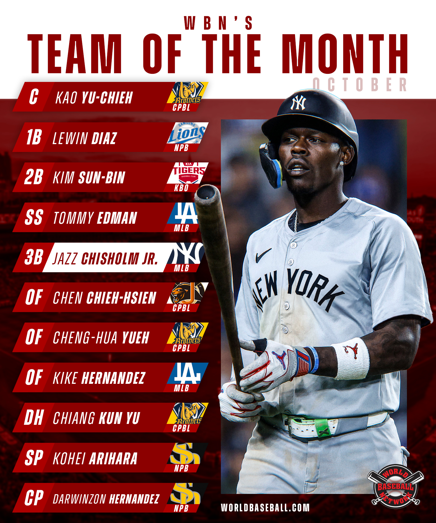 With leagues wrapping up their postseasons and most leagues crowing champions, we look back at the players who performed and excelled above expectations. Here is who is featured on World Baseball Network’s team of the month for October: