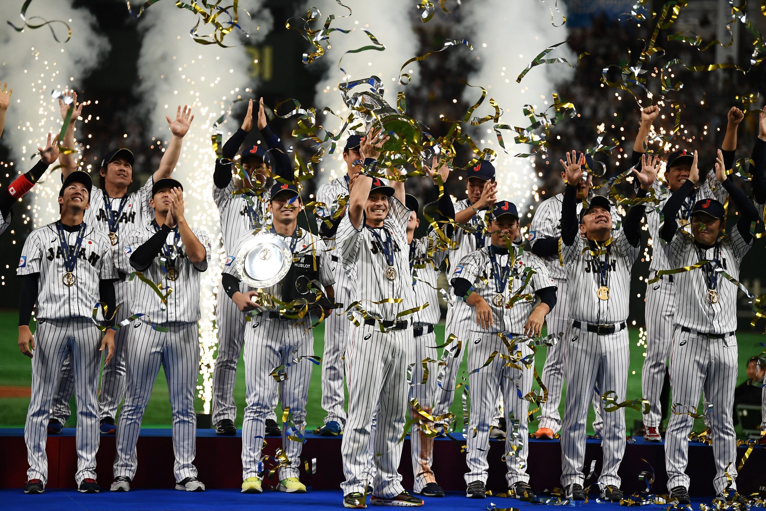 Photo Credit: Japan’s baseball players celebrate with the trophy their win against South Korea. (Photo by CHARLY TRIBALLEAU / AFP) (Photo by CHARLY TRIBALLEAU/AFP via Getty Images)