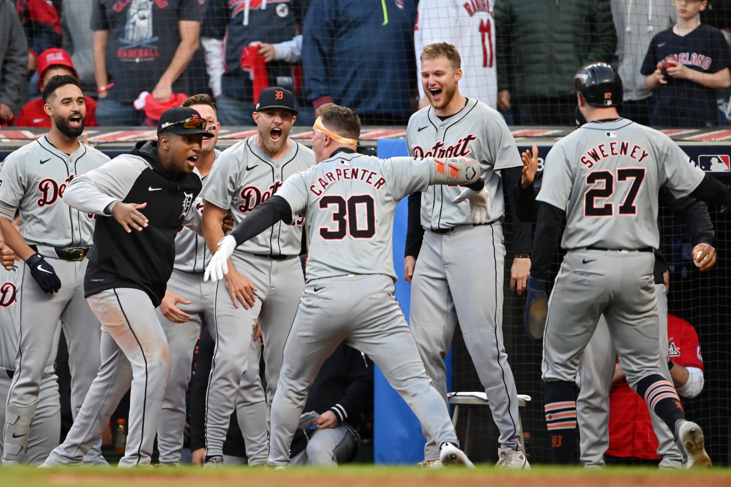 Photo Credit: Kerry Carpenter #30 of the Detroit Tigers celebrates with teammates after hitting a home run in the ninth inning against the Cleveland Guardians during Game Two of the Division Series at Progressive Field on October 07, 2024 in Cleveland, Ohio. (Photo by Nick Cammett/Getty Images)