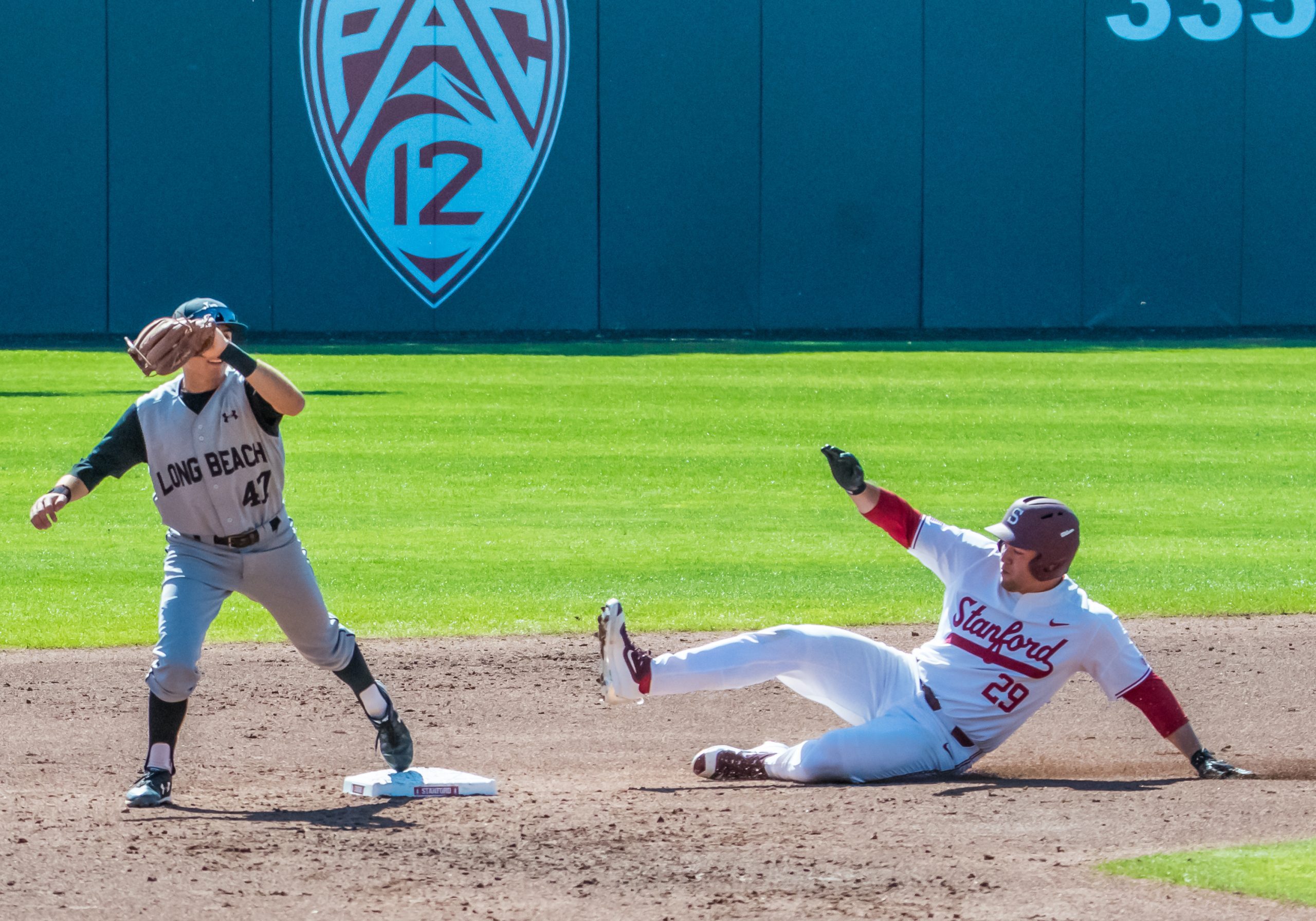 Photo Credit: Long Beach St. infielder Matt Gimenez (47) makes a force play on Stanford outfielder Brandon Wulff. (Photo by Douglas Stringer/Icon Sportswire via Getty Images)