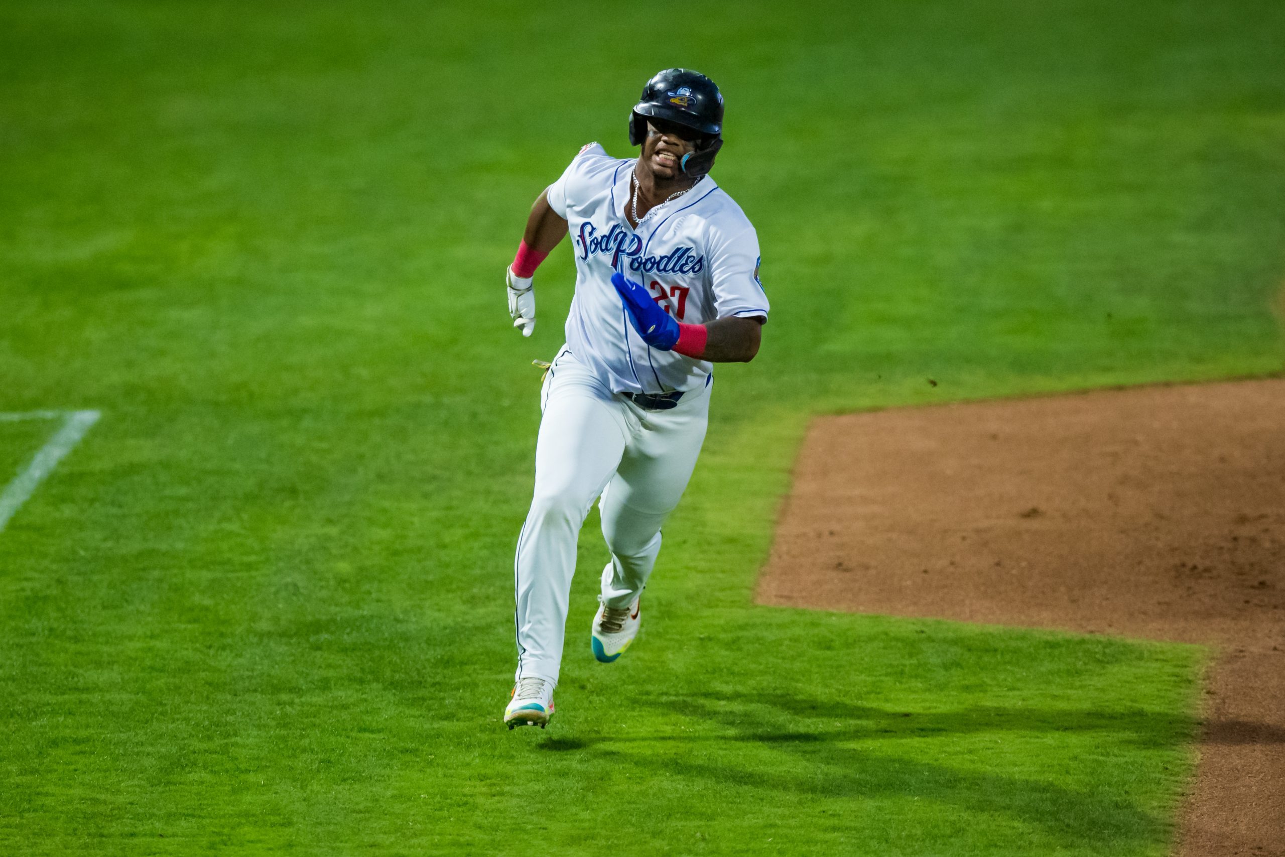 Photo Credit: Infielder Deyvison De Los Santos #27 of the Amarillo Sod Poodles runs to home plate during the game against the Arkansas Travelers at HODGETOWN Stadium on September 09, 2022 in Amarillo, Texas. (Photo by John E. Moore III/Getty Images)