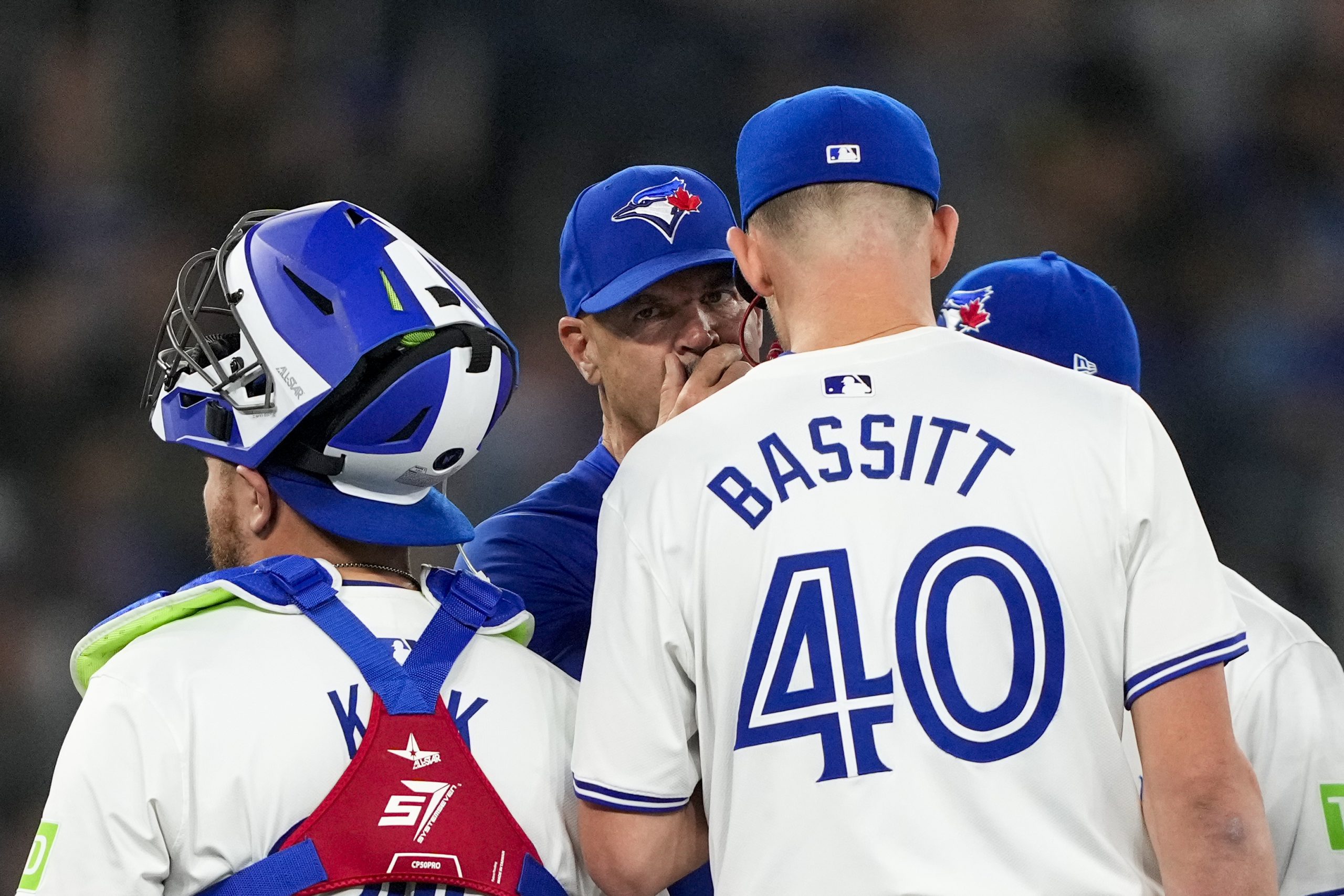 Pete Walker #41 of the Toronto Blue Jays talks to Chris Bassitt. (Photo by Kevin Sousa/Getty Images)