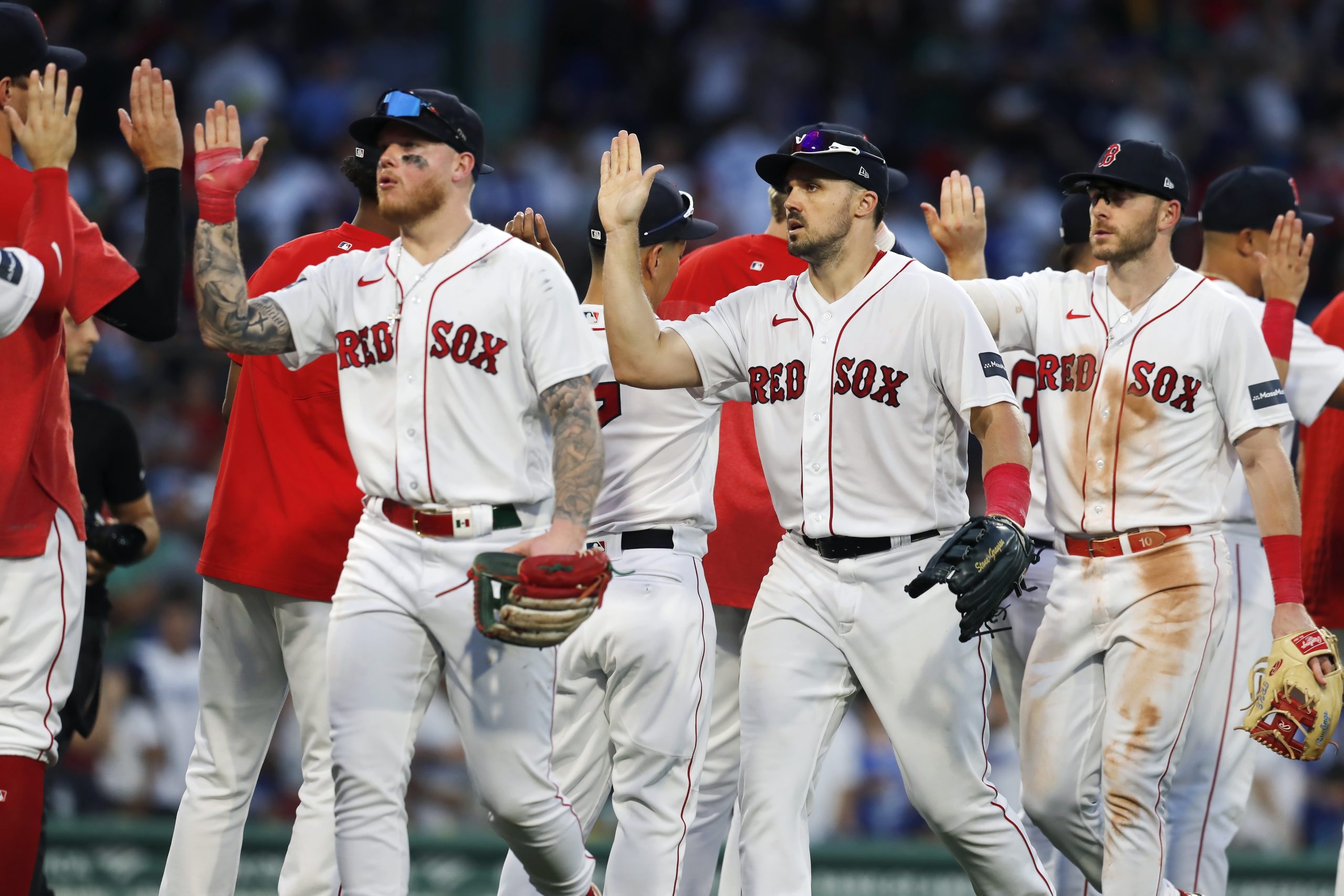 Photo: Boston Red Sox’s Alex Verdugo, Adam Duvall and Trevor Story celebrate with teammates after defeating the Los Angeles Dodgers in a baseball game, Saturday, Aug. 26, 2023, in Boston. (AP Photo/Michael Dwyer)