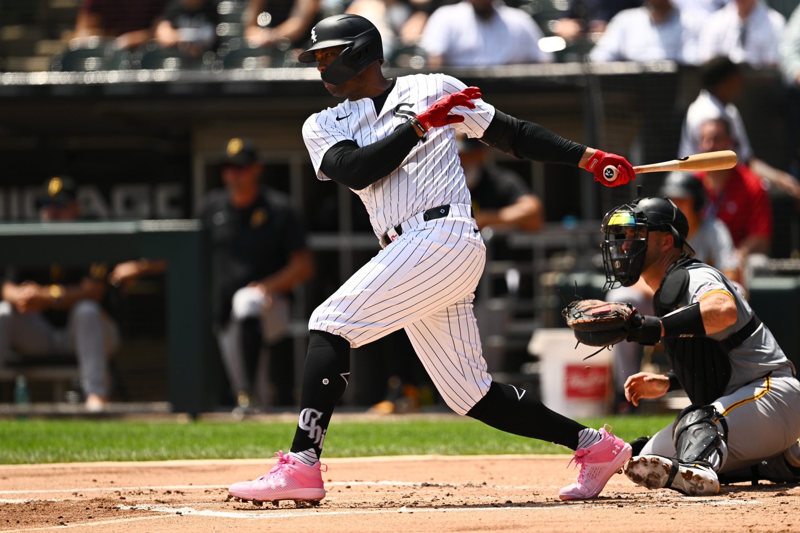 Photo Credit: Eloy Jiménez #74 of the Chicago White Sox bats in a run after hitting into a double play in the first inning off Mitch Keller of the Pittsburgh Pirates at Guaranteed Rate Field on July 14, 2024 in Chicago, Illinois. (Photo by Quinn Harris/Getty Images)
