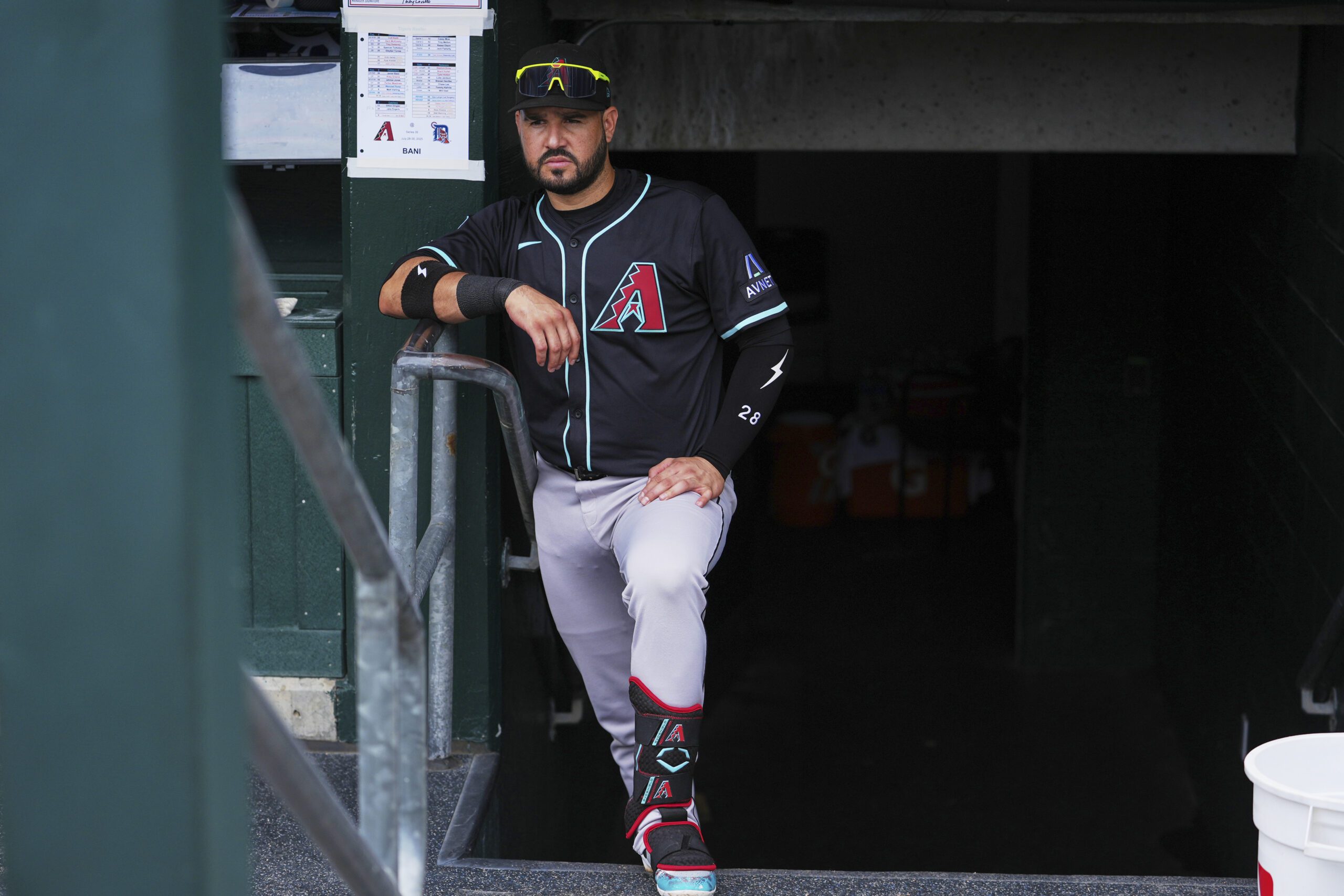 Photo: Eugenio Suarez stands on the stairs of the dugout during the sixth inning of a baseball game against the Detroit Tigers, Wednesday, July 30, 2025, in Detroit. (AP Photo/Ryan Sun)
