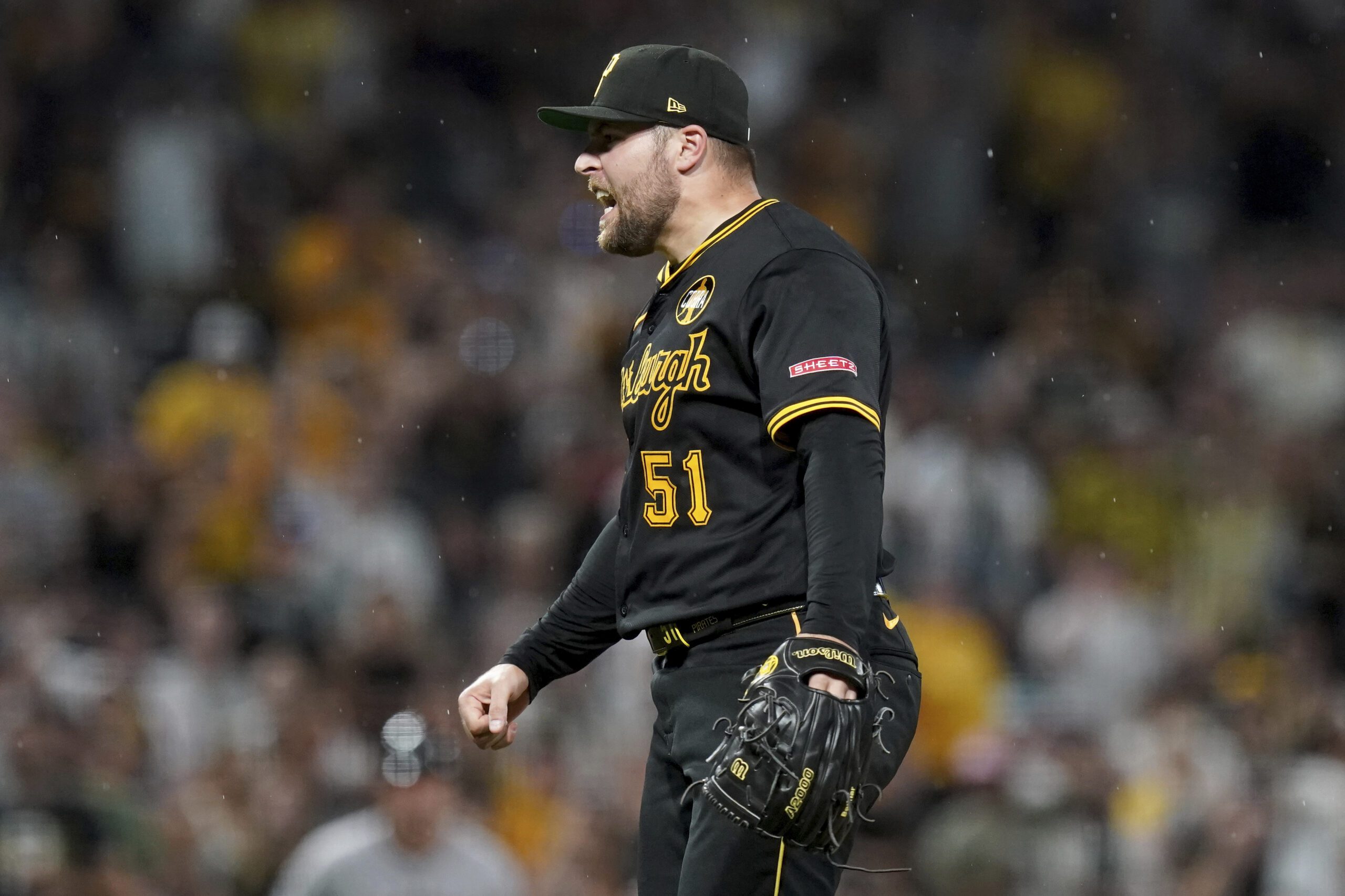 Photo: Pittsburgh Pirates pitcher David Bednar reacts after getting the final out of a baseball game against the Arizona Diamondbacks, Saturday, July 26, 2025, in Pittsburgh. (AP Photo/Matt Freed)